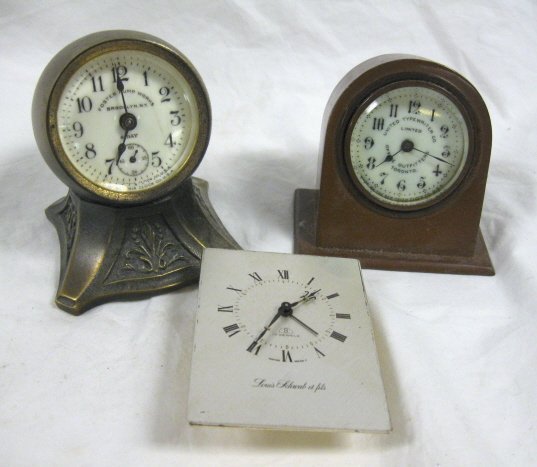3 SMALL CLOCKS, 2 ARE ADVERTISING, 1 MODERN; 3 1/4 – 4 IN; ALL CLOCKS SOLD AS IS/AS FOUND. WORKING CONDITION IS UNKNOWN, POSSIBLY MISSING PENDULUM, WEIGHTS, PIECES, PARTS AND/OR KEYS