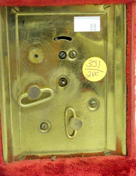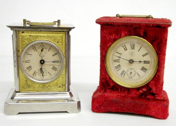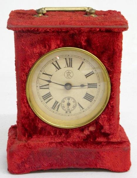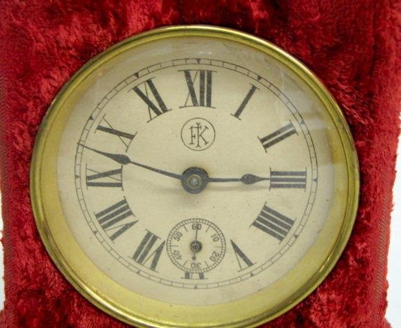 1.) Florence Kroeber red plush clock. Fixed key wind with a 3 1/2″ dial in excellent condition. 6 1/2″ x 5 1/4″ and running at this time (The plush has some wear on the edges. The strike bell is missing.)