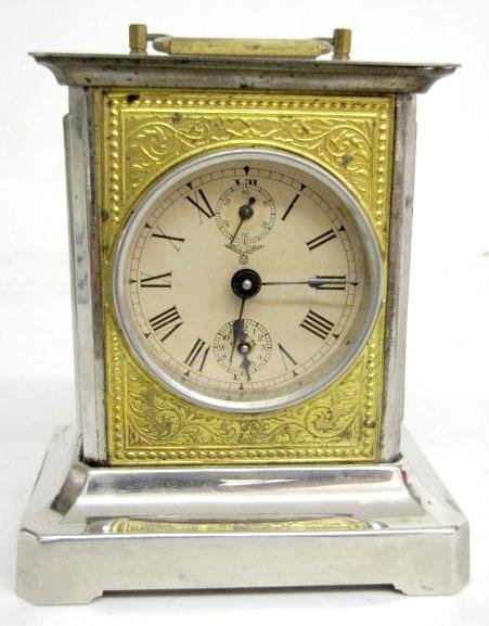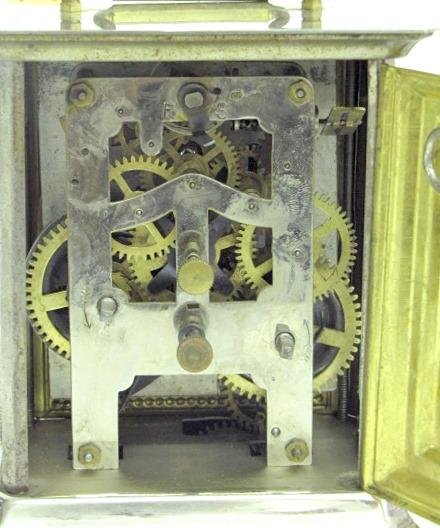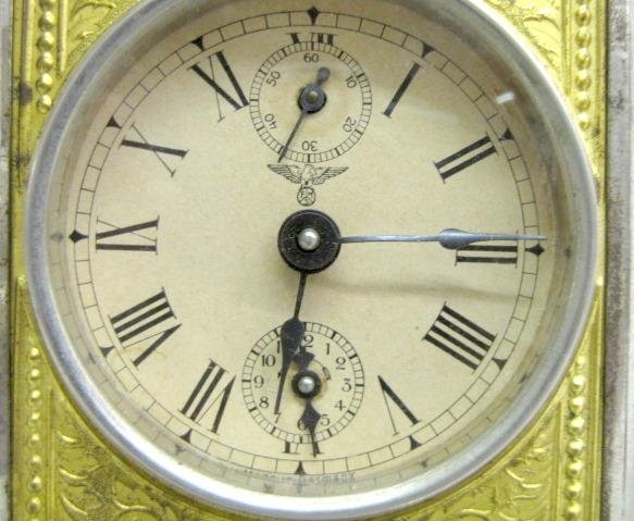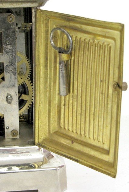 2.) German FMS musical alarm clock. Nickel plated and glass case, key wound springs. The 2 3/4″ dial has an alarm and seconds dial on it. The tune it plays is Whispering While you Cuddle Near Me. 6″ x 5 1/4″, the clock and music works (The metal finish is spotty.)