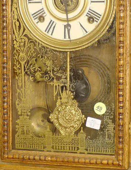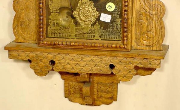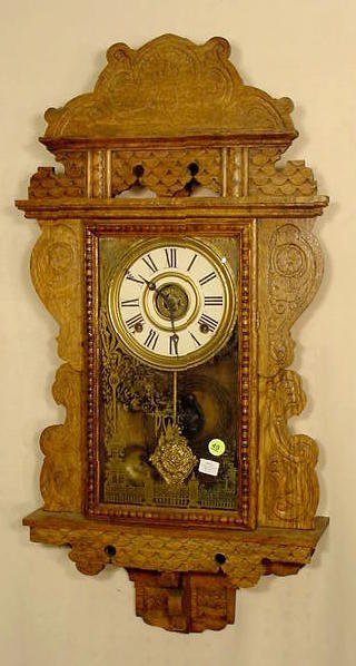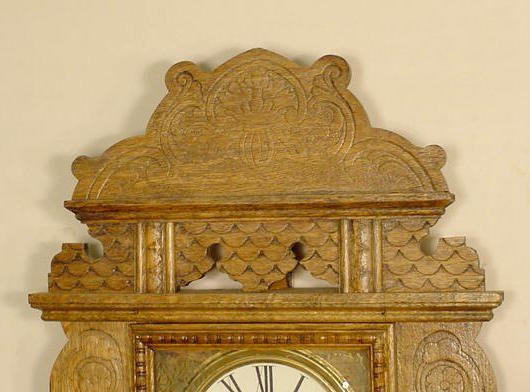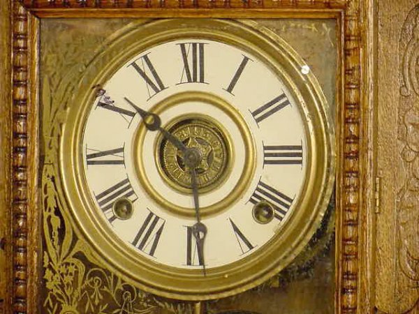 Sessions oak hanging kitchen clock with alarm: (Pressed oak case, partially stripped, refinished & restored; center bottom trim area gone; dial recovered; glass worn with paint losses.)