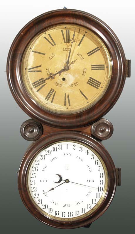 Ingraham Ionic Calendar Clock Circa 1880. Time only with calendar. Good label on interior. Lower calendar cover missing. Rosewood case. 29-1/2″ x 16-1/2″. (Very Good).