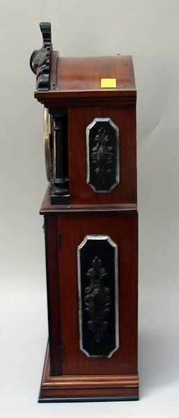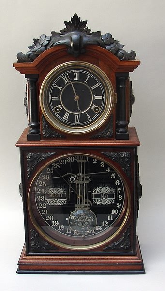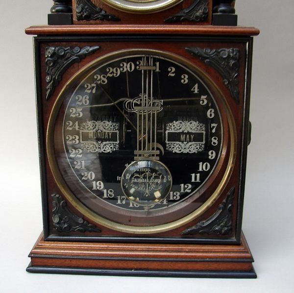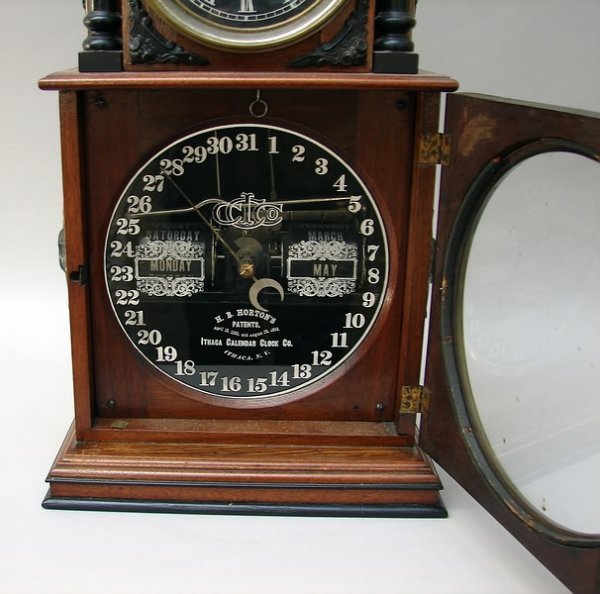 Ithaca # 3 1/2, Parlor model- 8 day, time and strike with calendar giving month, day and date, glass pendulum with Ithaca logo, walnut with ebonized trim, 20″ H x 10 1/2″ W x 5 1/2″ D.