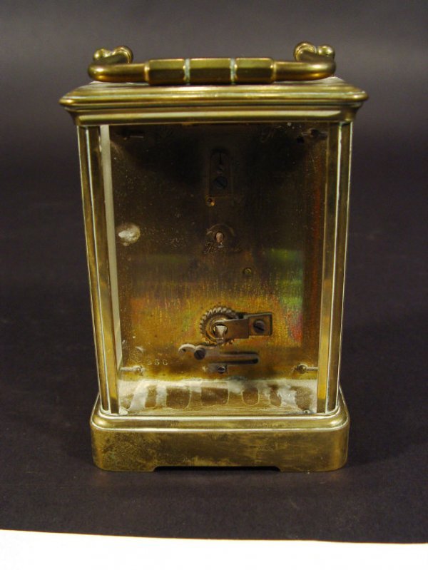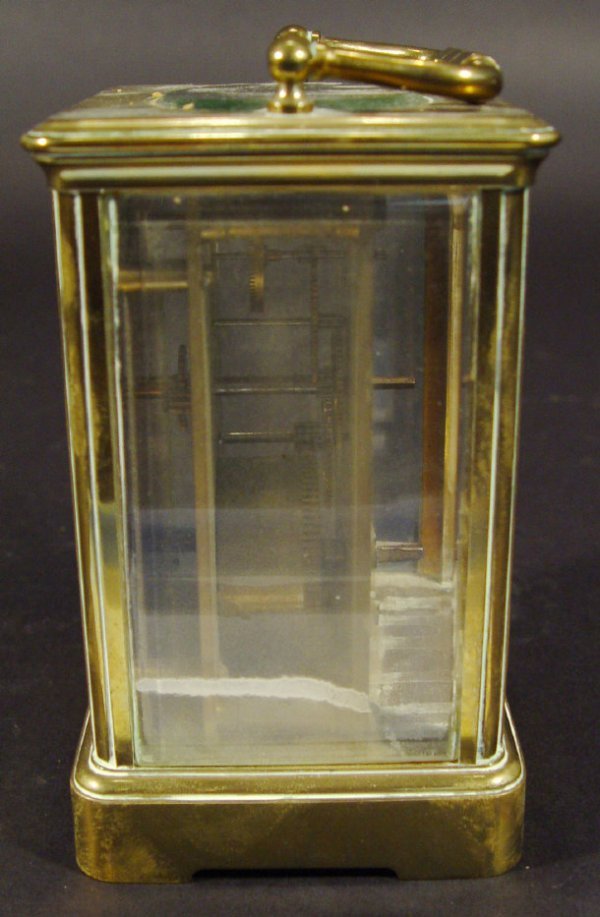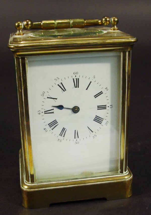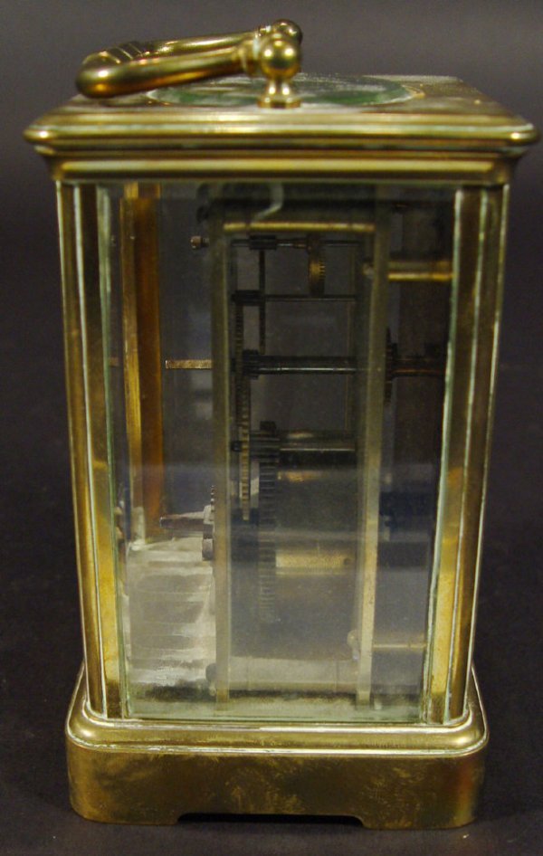 Brass cased carriage clock with swing handle, bevelled glass panels and painted enamel dial, retailer’s paper label to the base, 17cm high