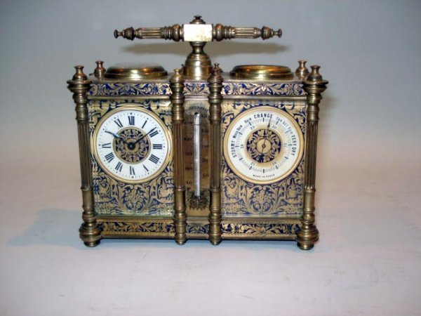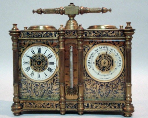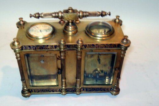 Rare Painted French Enamel and Bronze Double Carriage and Barometer Clock