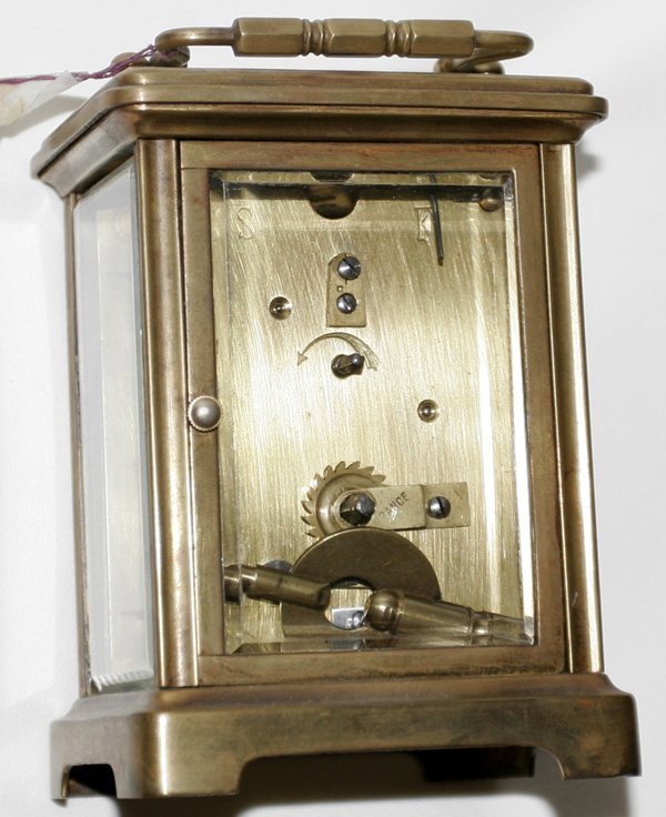 FRENCH BRASS & BEVELED CRYSTAL CARRIAGE CLOCK RETAILED BY TIFFANY & CO., H 5 1/2″, W 3″:With key. From the Collection of Lawrence Scripps Wilkinson, Grosse Pointe Farms.