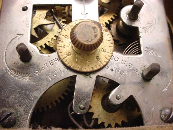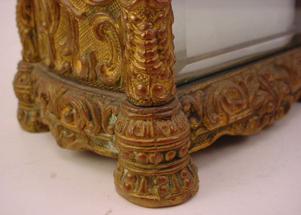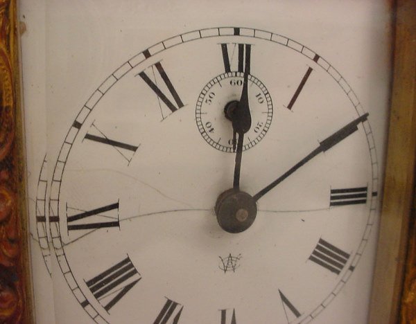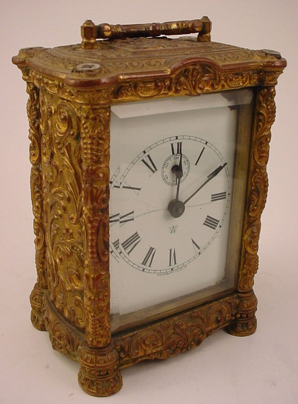 “Waterbury Clock Co” Cast Brass Carriage Clock. Replaced screws in need of restoration. Hairline in porcelain dial. 6 3/4″h x 4 1/2″ x 3 1/4″d