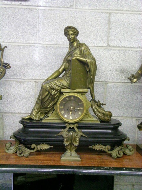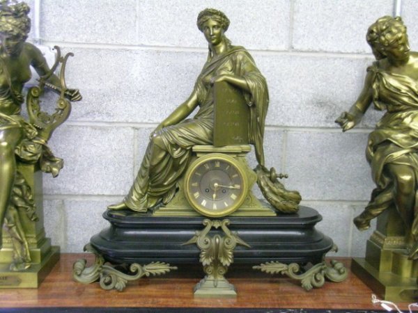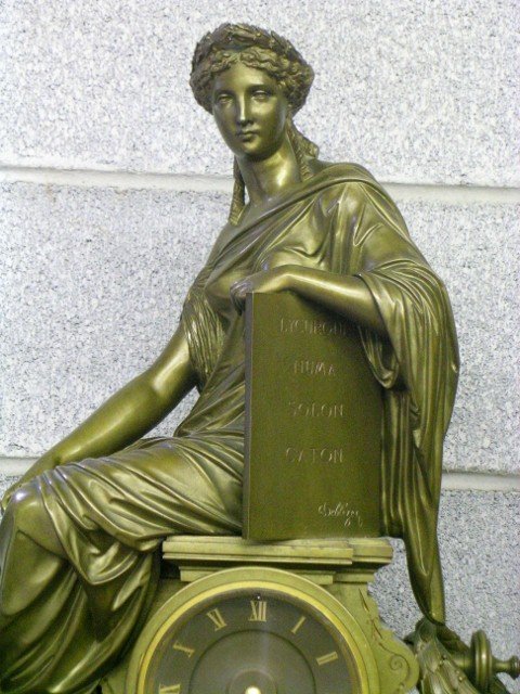 French(19th century) bronze and marble figural clock, inscribed “Lycurgue Numa Solon Caton”, artist signed Deblezez; 25 in. H.