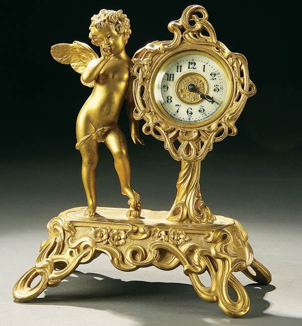 AN ANSONIA FIGURAL SPELTER CLOCK circa 1900 of a young Cupid. Height 7.5 inches. Estimate $200-$300