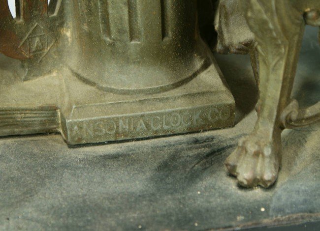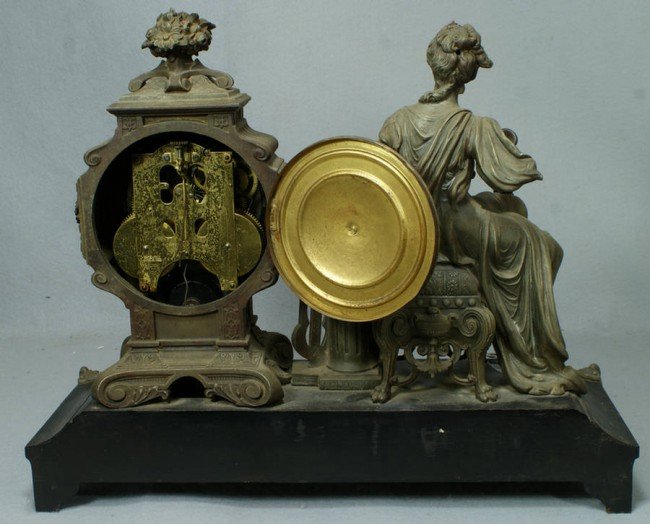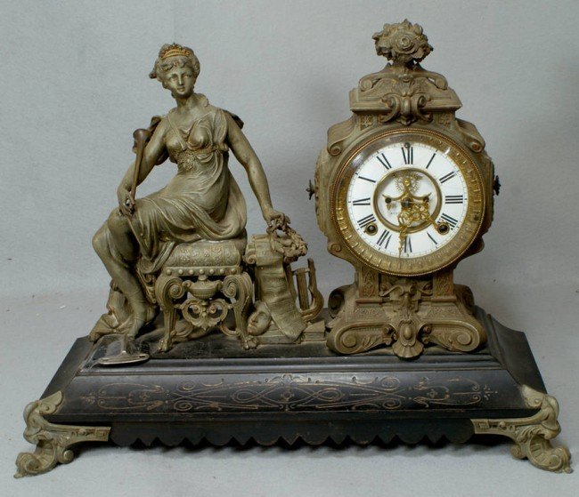 Ansonia “Opera” figural mantle clock, open escapement, key, no pendulum, 16″ high, lines throughout dial, finish rough