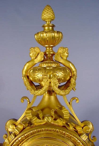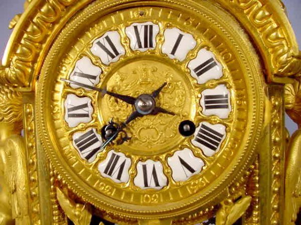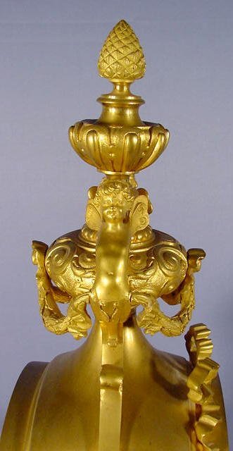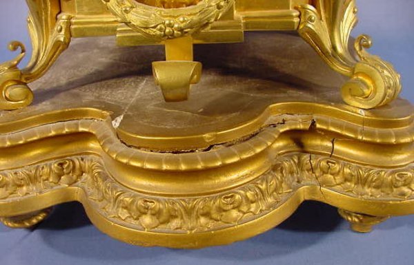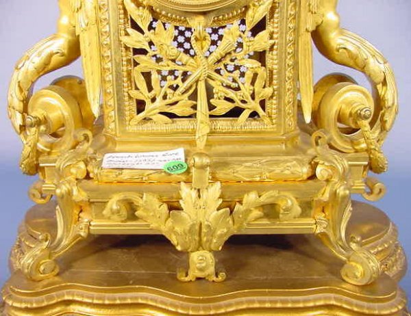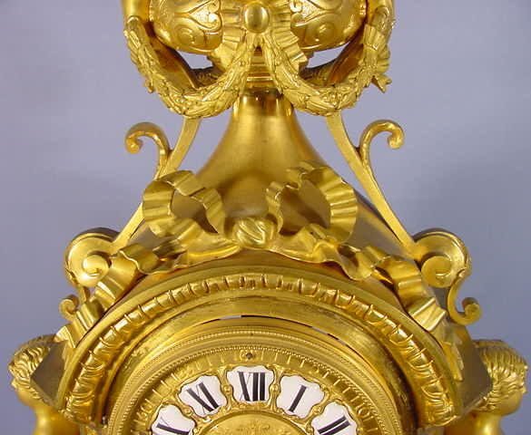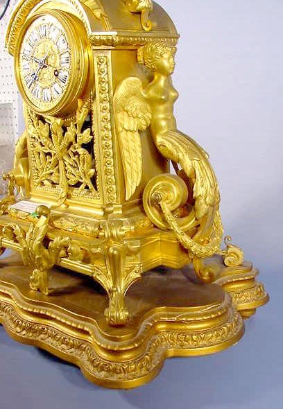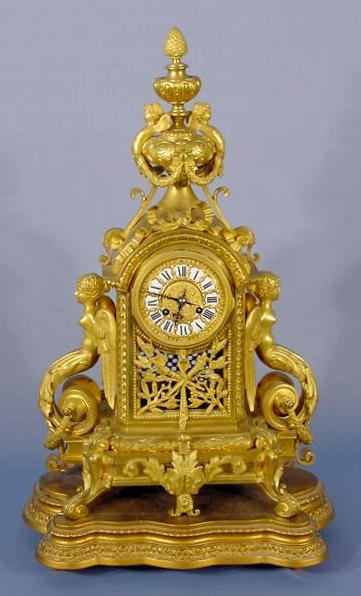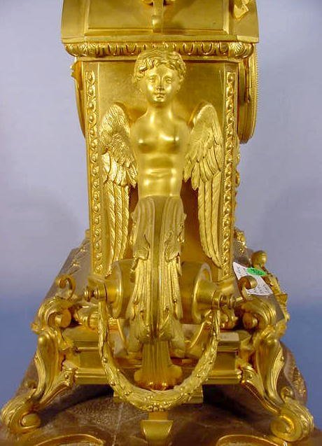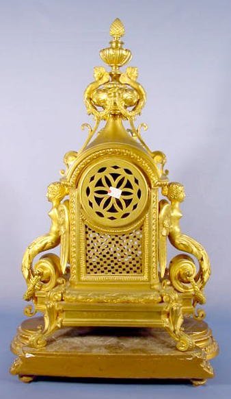 French Bronze Clock: with winged figures on the sides and top. Plus ribbons, acanthus leafs and crossed torches. Time and strike movement with a 4 1/2″ fancy bronze dial with porcelain numerals and cast seconds. The clock sets on a painted wood platform. Movement is numbered 15997 and 58.