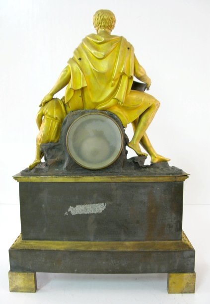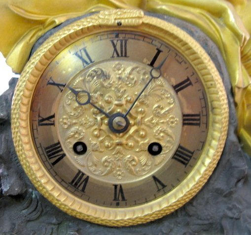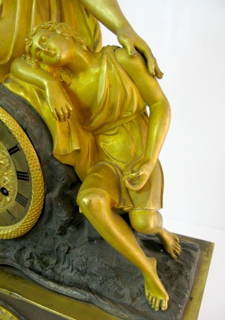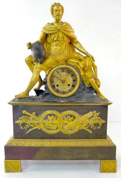 French Dore & Bronze Silk String Figural Clock: the time with half hour bell striking movement is numbered 2875. The dial with fancy center is 4″ wide with a snake form as a bezel. The case is topped with a bearded man and sleeping woman; the man holds a Roman style helmet. The case front has sword, axe, spear and arrows in joined wreaths. The feet also have swords and axe designs.