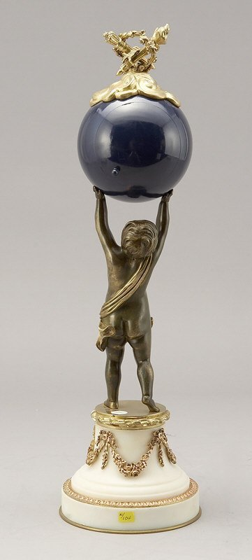 French gilt bronze striking figural mantle clock modeled as a putti holding aloft a blue orb with applied Arabic chapters. Eight day, French, front-wound movement. White marble socle. Restorations. Provenance: From the estate of Albert Copeland, a longtime Dallas antique dealer. 22.5″H, Circa – 1900.