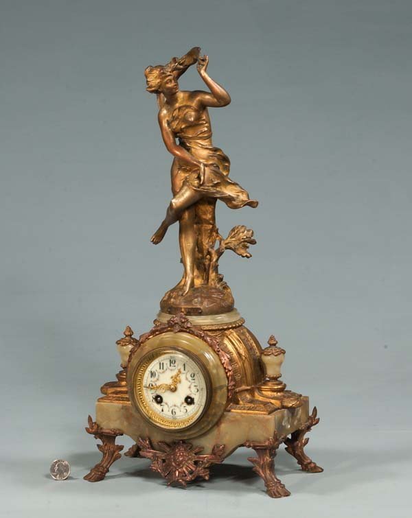 French green onyx mantle clock with figure of a woman at the top, c.1880, 10″ wide, 19″ high