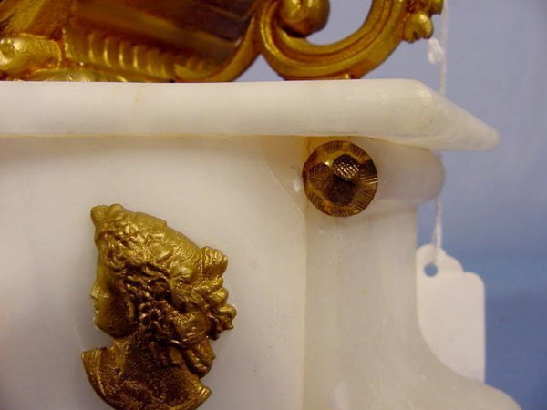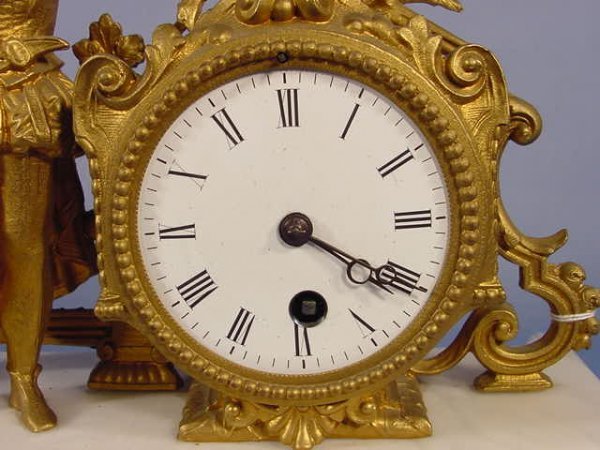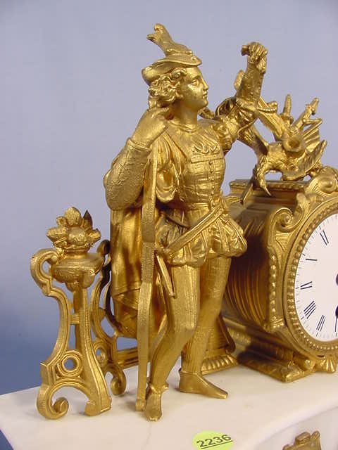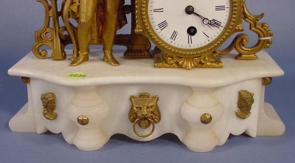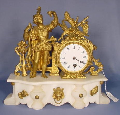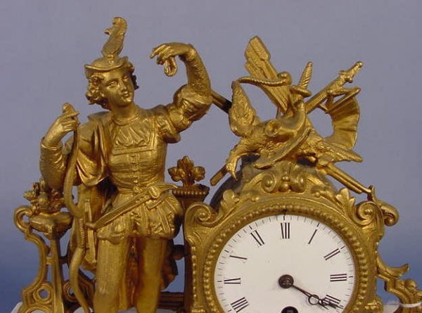 French Spelter and Marble Figural Clock with a bowman on top. Time only movement numbered 4053 and a 3″ porcelain dial.