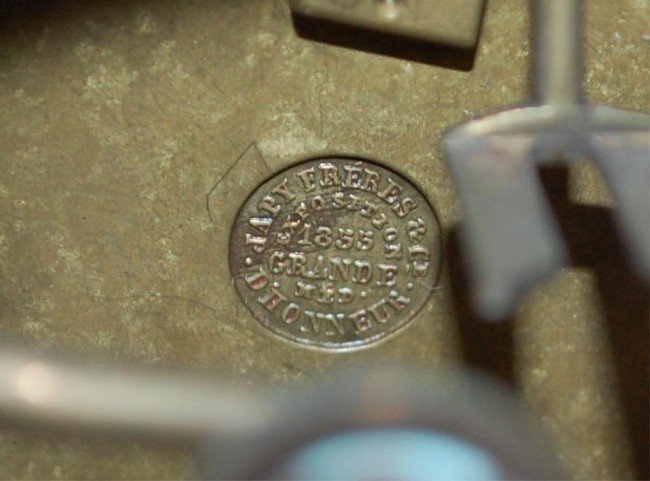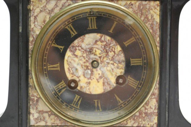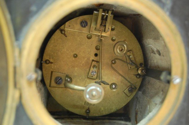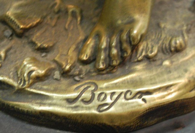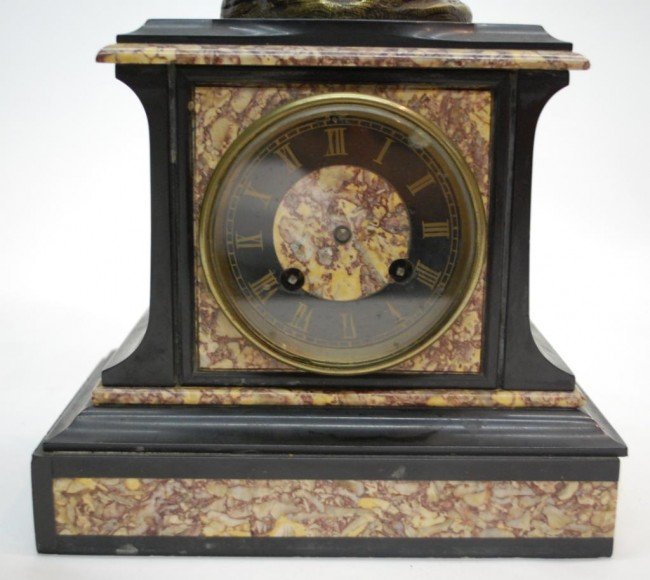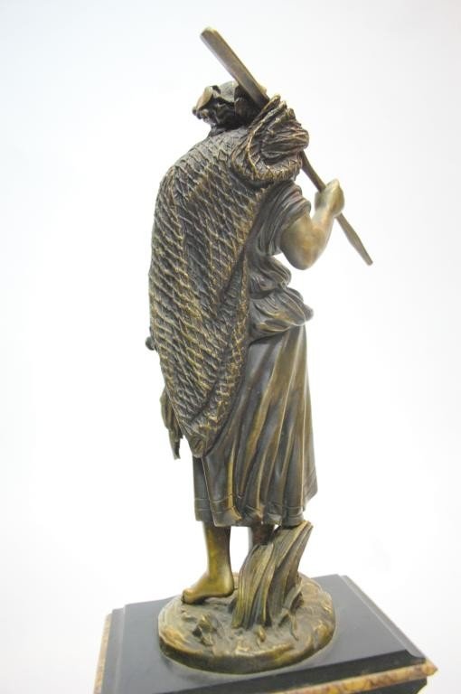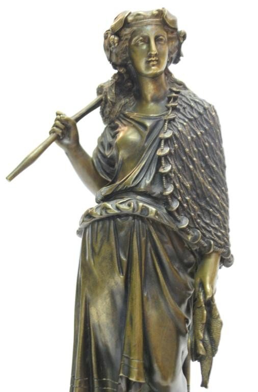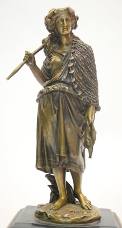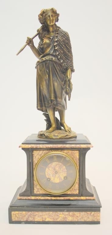 Movement Marked “Japy Freres and Ce. Exposition Grande D’Honneur”. Surmounted with Bronze sculpture of classically dressed woman with a fishing net draped over her shoulder holding her catch. Bronze Basesigned Boyer. Marble dial and brass movement. 19″ tall.