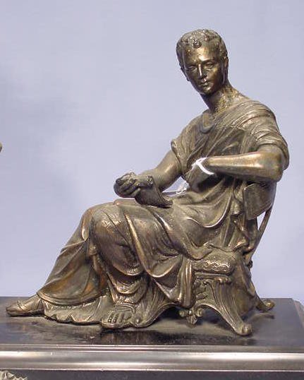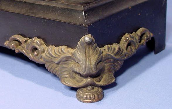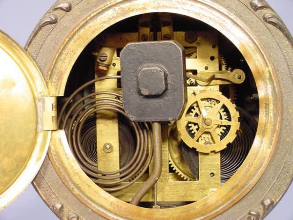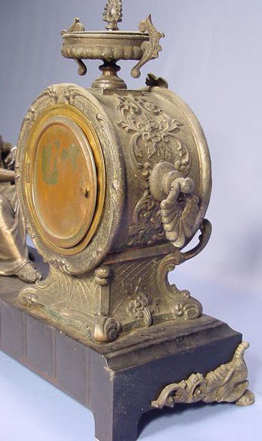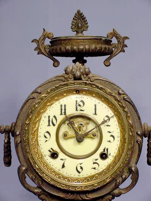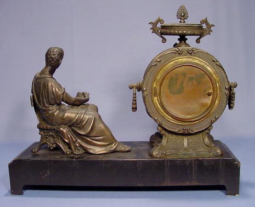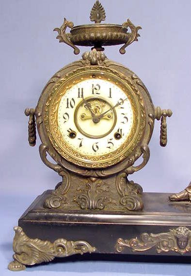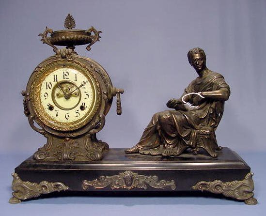 New Haven Octavius Figural Clock with 8 day half hour strike, cathedral gong , open escapement and a 4 1/4″ ivorized dial. Clock is running at this time.