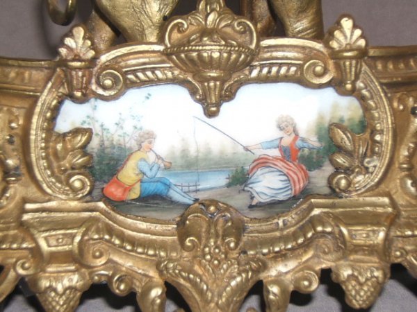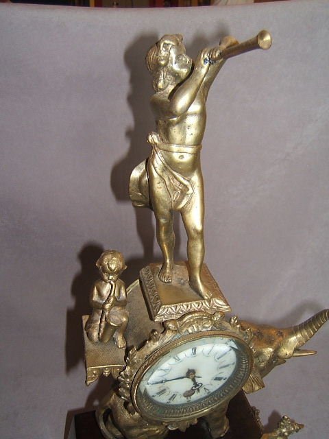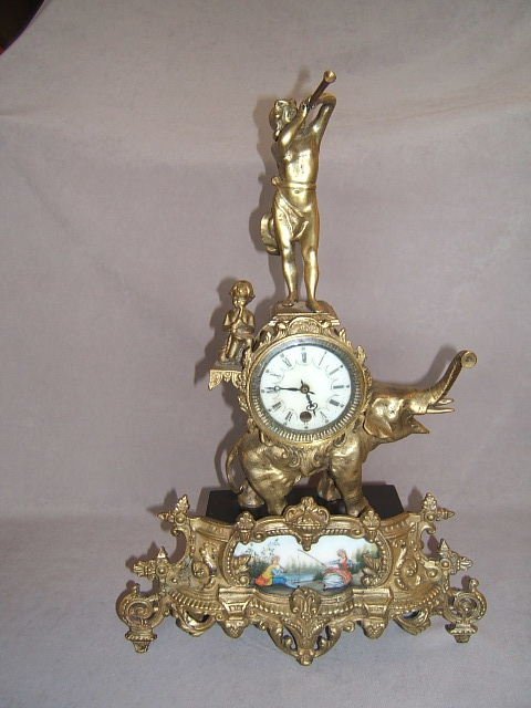 ORNATE BRONZE CASE FIGURAL CLOCK WITH KEY – 20″ HIGH, 14″ WIDE, CRYSTAL COVER AS/IS, SOME WEAR TO FINISH