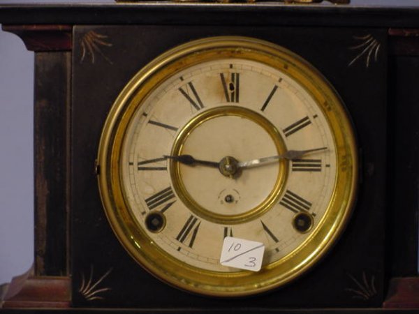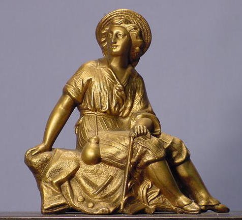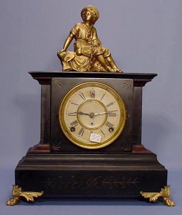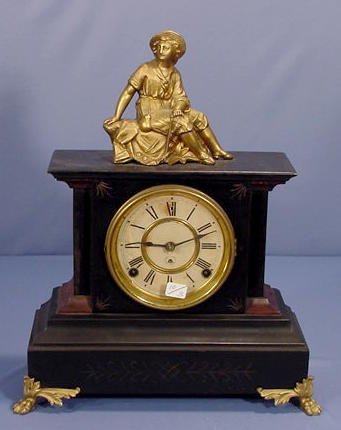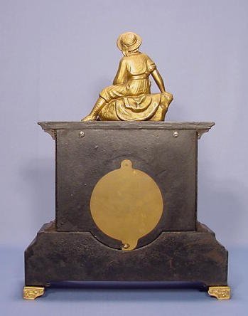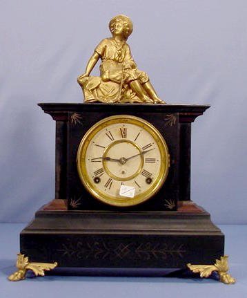 Seth Thomas Figural Iron Mantle Clock with time and strike movement and a 4 1/2″ paper dial. The figure is of a weary traveler on top of the iron case. Clock is running at this time.