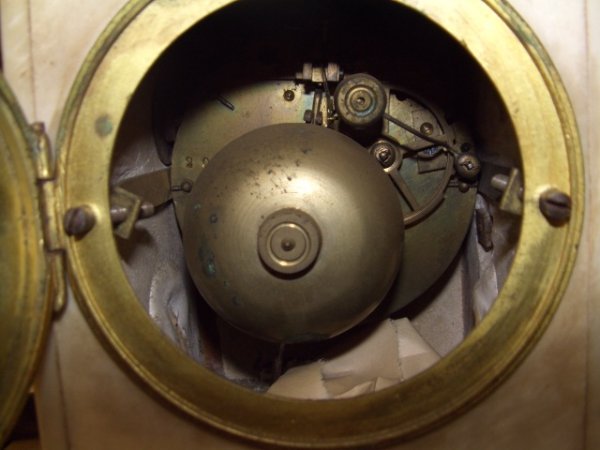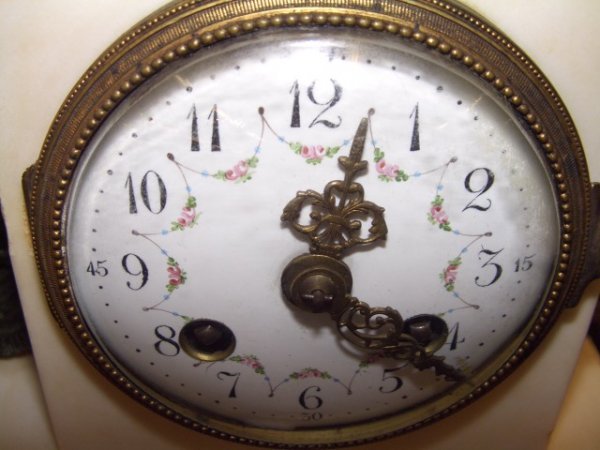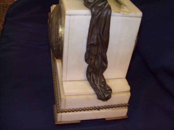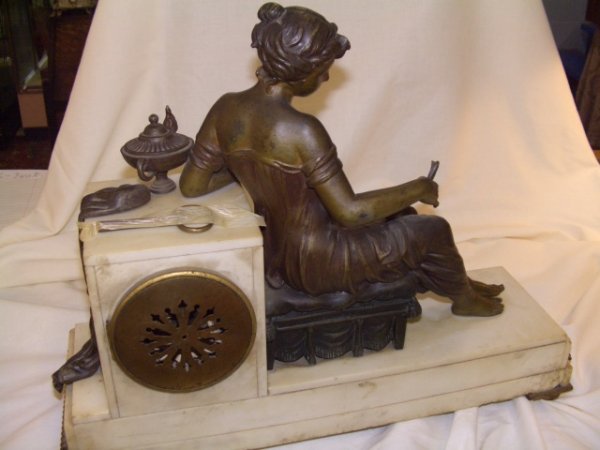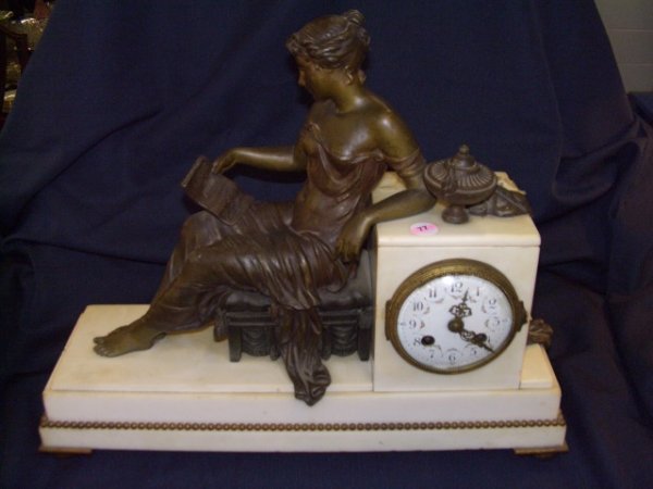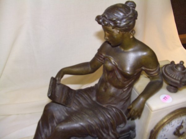 with stately woman with urn and draped robe over the edge of the pillar. holding a open book while seated on stool. stamped # on the clock maker unknown 13 1/2 x 16 x 5 special shipping needed