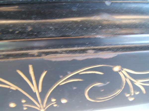 IRON CASE MANTEL CLOCK WITH PENDULUM -1 HAND MISSING – 11″ HIGH, 13 1/2″ WIDE, 6 1/2′ DEEP, SOME WEAR TO FINISH, LOSS TO DECORATION