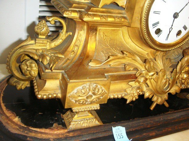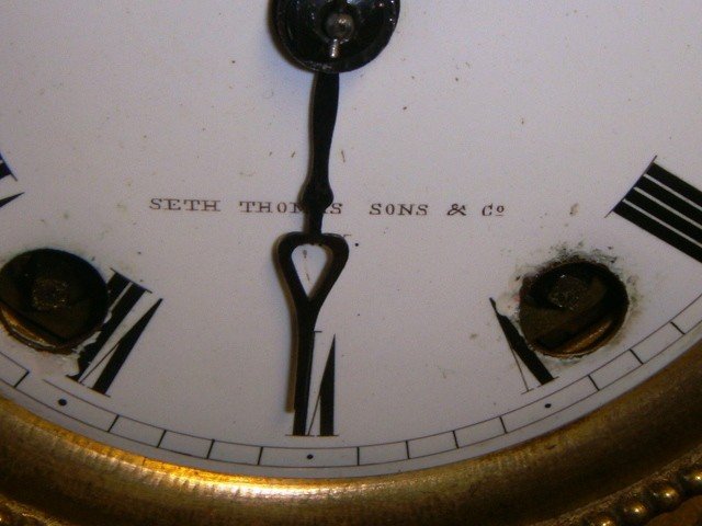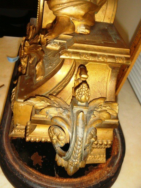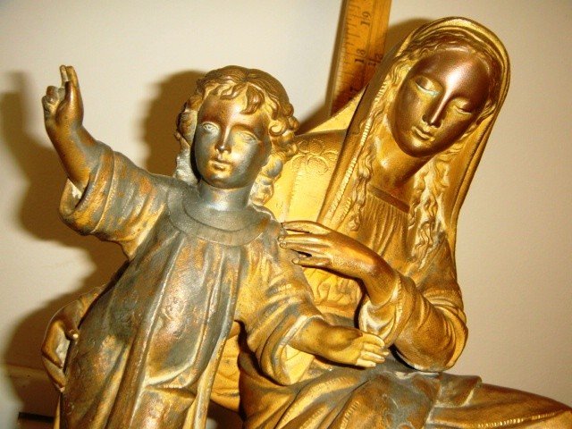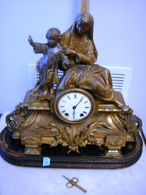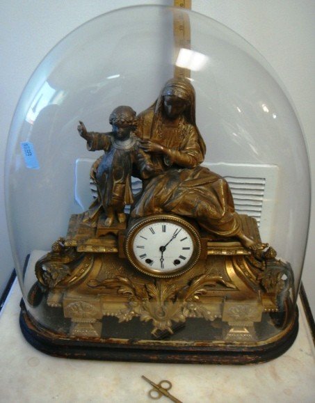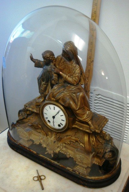 Seth Thomas and Sons Bronze Mantel Clock Under Glass Dome with Mother and Child – dome 21 in. tall base 18 in. long 8 in. deep