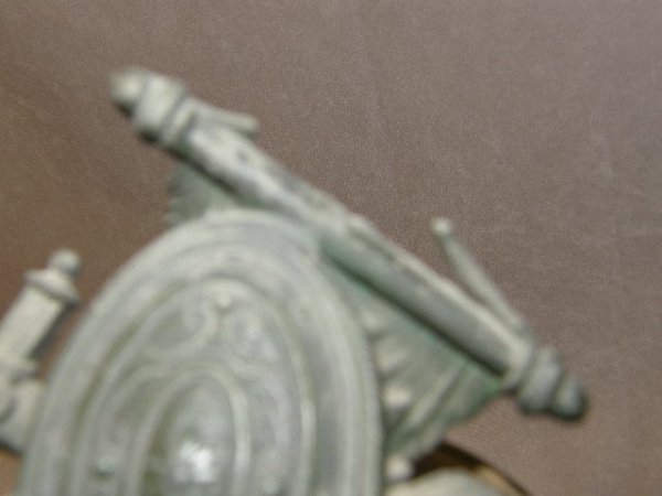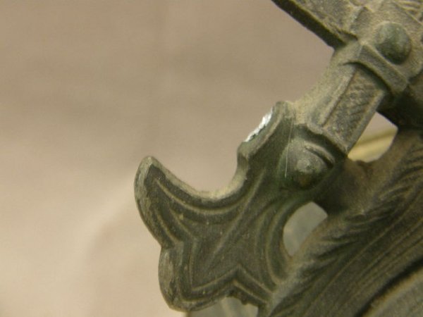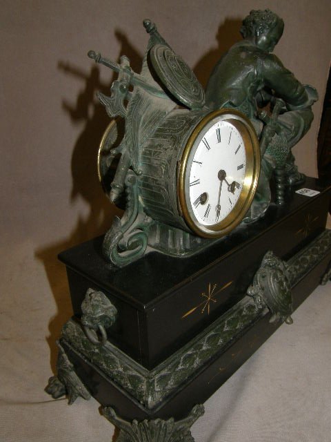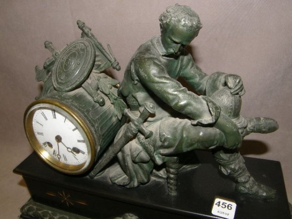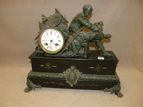 METAL AND SLATE FIGURAL CLOCK WITH KEY (AX TIP BROKEN) – 13 1/2″ HIGH, 16″ X 6″ – SOME WEAR, SCRATCHES, LOSS TO DECORATION