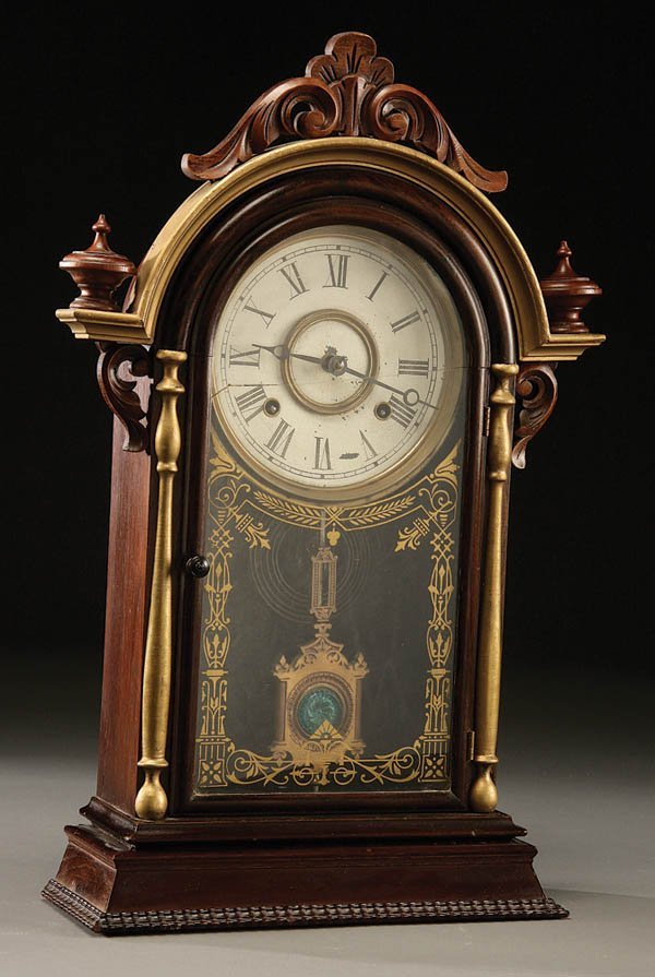 A VICTORIAN ROSEWOOD SHELF CLOCK with domed top and carved decoration. Reverse painted glass panel (crack). Height 23 inches. Estimate $100-$200