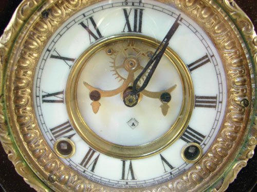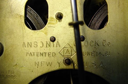 Ansonia Antique Shelf Clock with ebonized case. missing crest decoration. 11″h x 13 1/4″w x 5″d