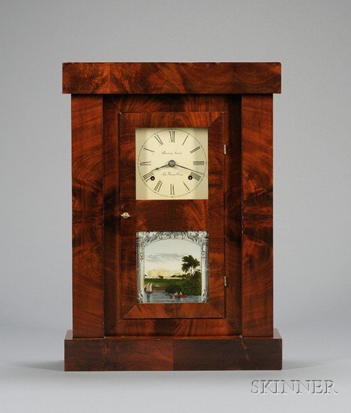Empire Mahogany Shelf Clock by Chauncey Jerome, New Haven, Connecticut, c. 1845, with flat columns supporting boxed cornice and base, printed maker’s label with view of the factory and legend Patent Clocks, Manufactured and Sold by Chauncey Jerome, New Haven, Conn., single glazed door with lower transfer and painted glass depicting “President’s House”, painted zinc dial with Roman numerals, thirty-hour weight powered movement with count-wheel strike and touch mark C. Jerome, ht. 24 1/2 in.