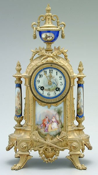 brass with gold painted surfaces, porcelain plaques, pillars and urn with figures in exterior settings, trophies of agriculture and music, 16-1/2 in. Provenance: Fisher Collection.