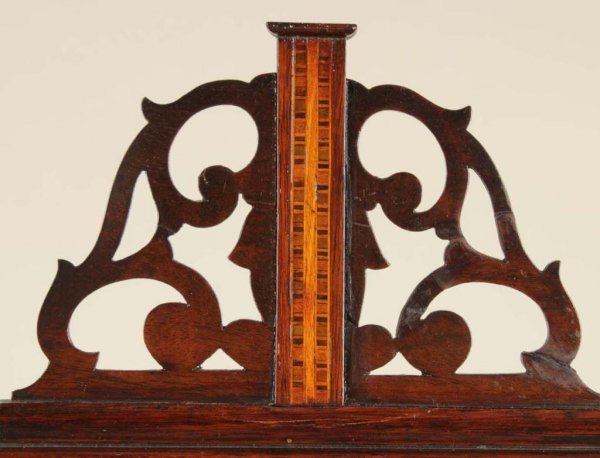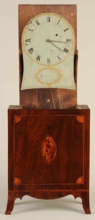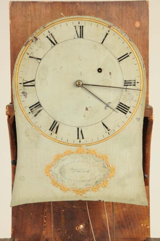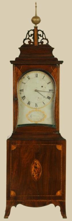 Description Circa 1800. Mahogany case with pierced fretwork, molded pediment, elaborate shell, fan, and banded inlays, and flaring French feet. 8-day time-only brass movement. Painted iron kidney-shaped dial signed “Willard” within a cartouche. Scattered touchup to dial. Case refinished. Otherwise excellent and original condition. Size 43″ H x 12 – 1/2″ W.