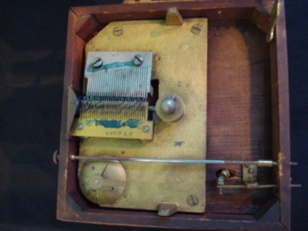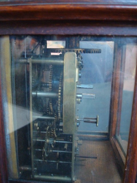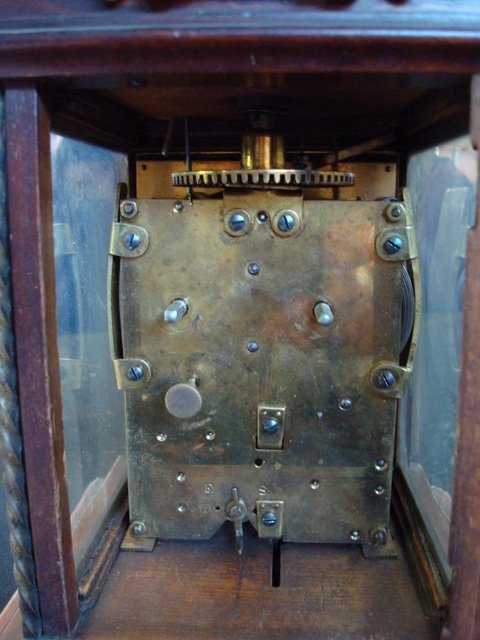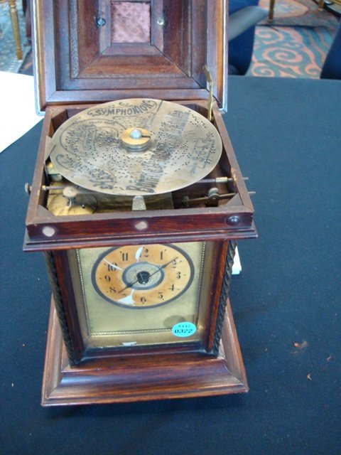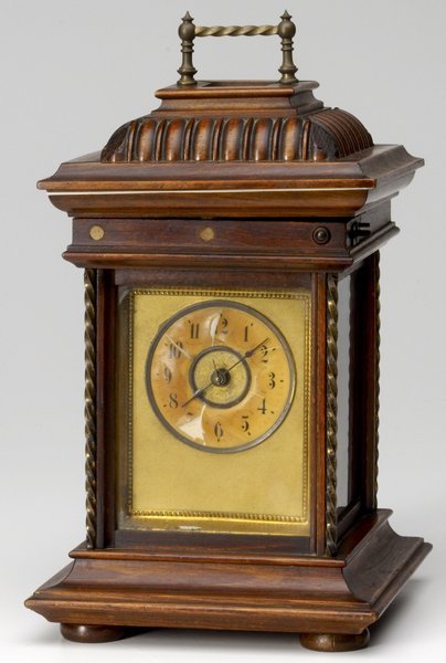 MUSICAL SHELF CLOCK Carriage type in oak case with two 4 1/2″ discs, possibly German. 12″
