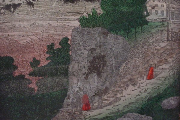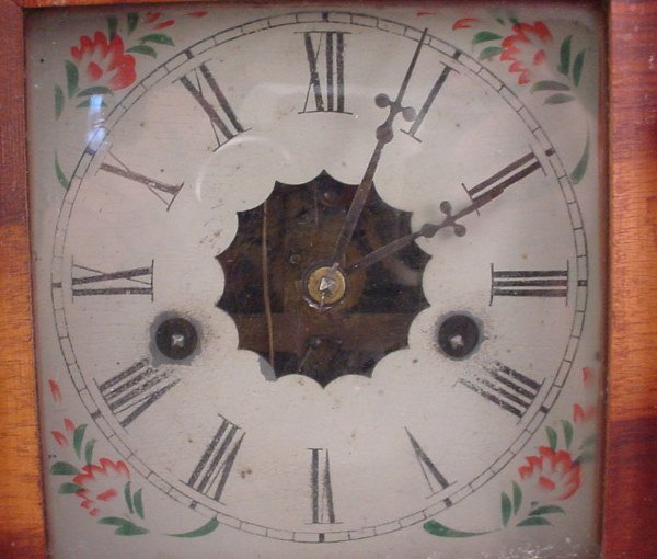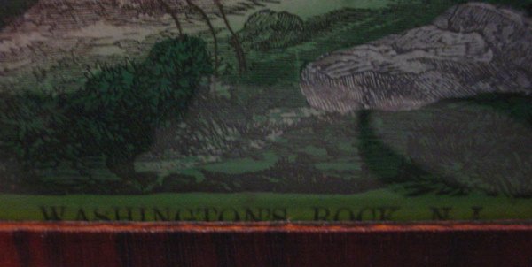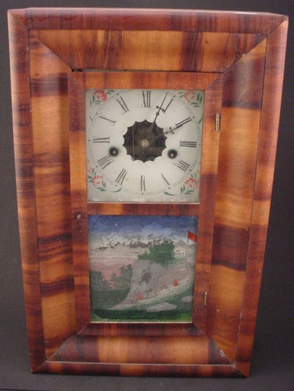 Ogee style Antique Shelf Clock with reverse painted tablet. Scene titled “Washington Rock NJ”. In need of restoration. 18″h x 11 1/2″w x 3 3/4″d