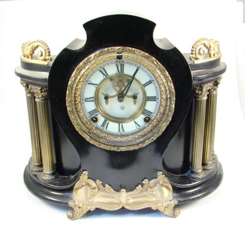 Ansonia Antique Shelf Clock with ebonized case. missing crest decoration. 11″h x 13 1/4″w x 5″d Images Click on thumbnails to see larger images: