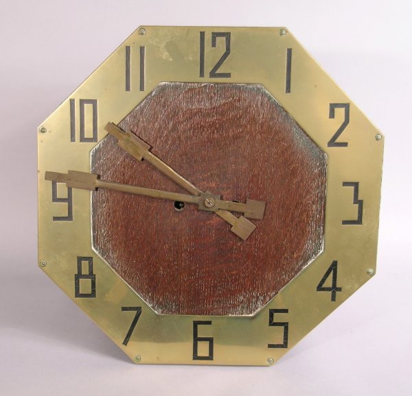 An oak art deco wall clock, the 15″ octagonal face with brass chapter ring of arabic numerals and two winding holes, the movement striking on five rod gongs, the brass pendulum with rectangular sliding bob engraved ‘Tempus Fugit’