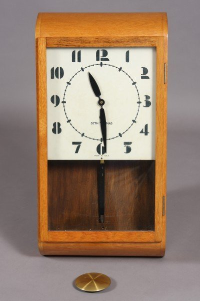American, second quarter 20th century. With rectangular oak case enclosing a stylized arabic numeral dial. Dimensions: H: 26″ W: 13 1/2″ Condition: Pendulum weight is detached from arm.
