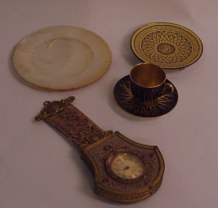 Bric a brac – Needlepoint wall clock 8 1/2″ x 4 1/4″, as is, Royal Worcester demitasse, mother of pearl dish, Spanish vermeil dish