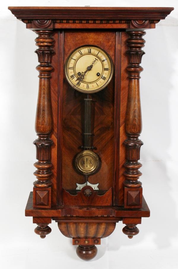 GERMAN WALNUT WALL CLOCK, 19TH C., H 32″, W 18″:With key.