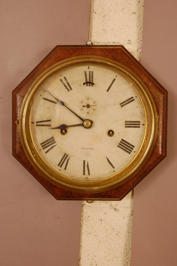 Seth Thomas #10 Wall clock in oak case with second hand. 11″dia. X 3 1/2″ deep. Ca. 1910